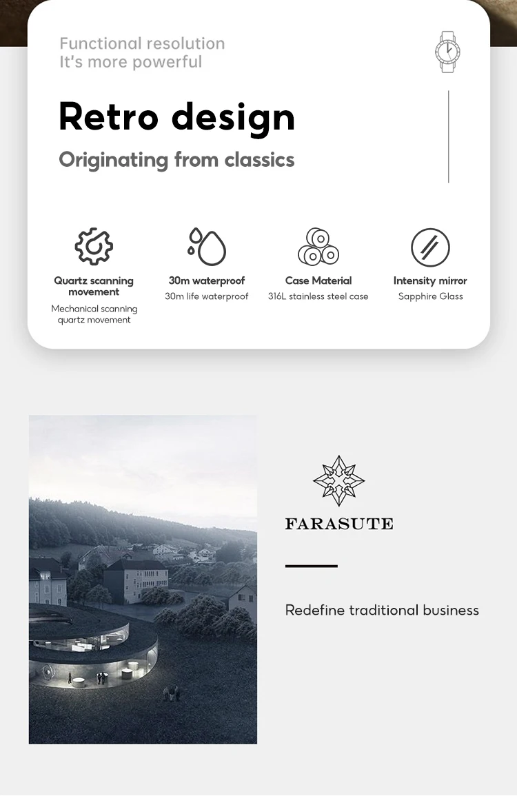 Farasute men’s quartz watch with Japan VH64 movement, sapphire crystal, leather strap, 36mm stainless steel case, and 3ATM water resistance.