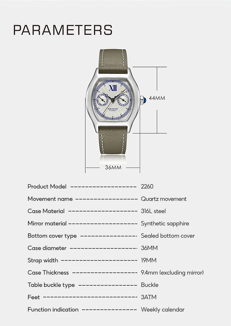 High-precision Japanese quartz movement for accurate and reliable timekeeping.316L Stainless Steel Case