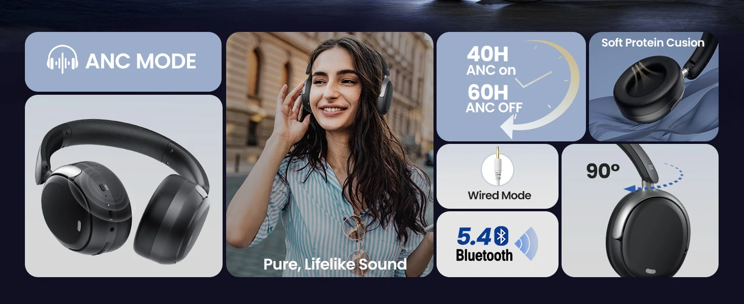 • Ultra-Long Battery Life: Up to 100 hours of playtime (up to 60 hours with ANC) with fast USB-C charging for extended use.