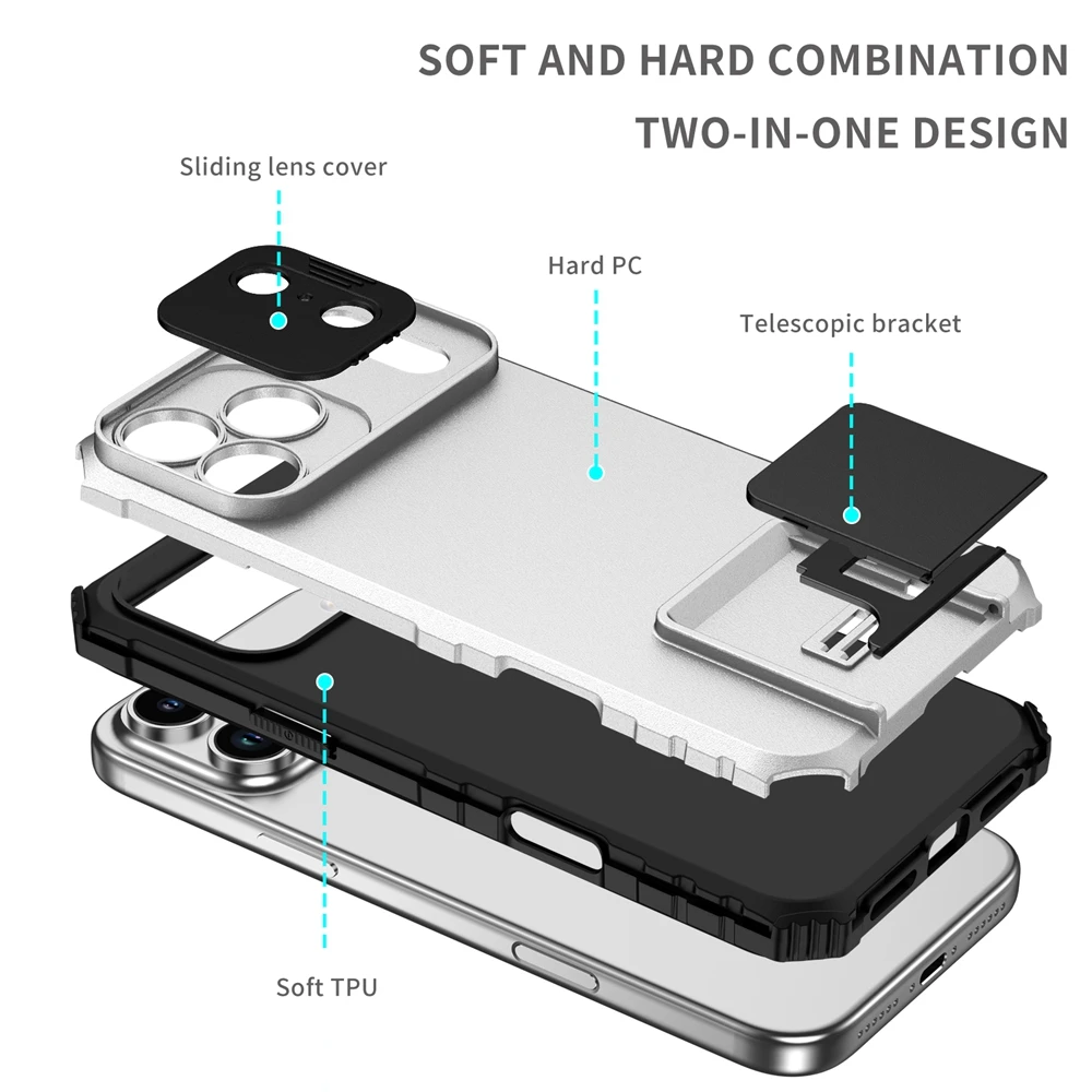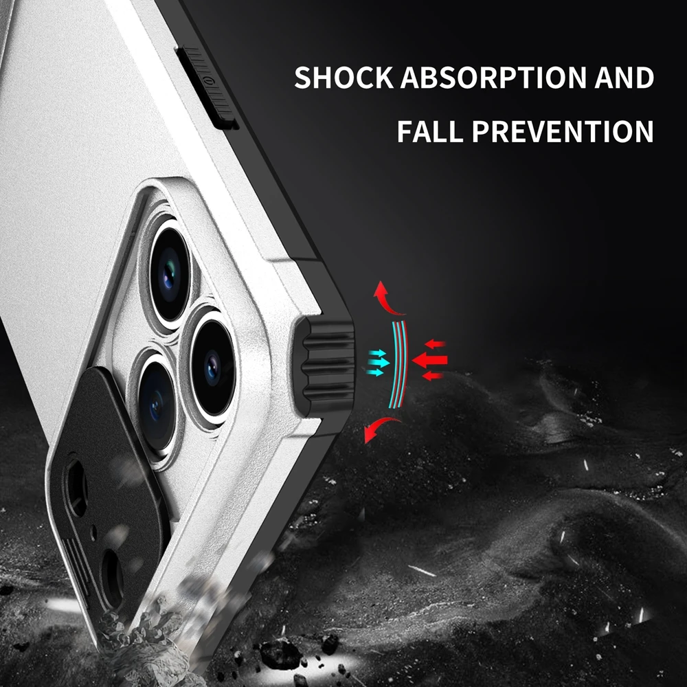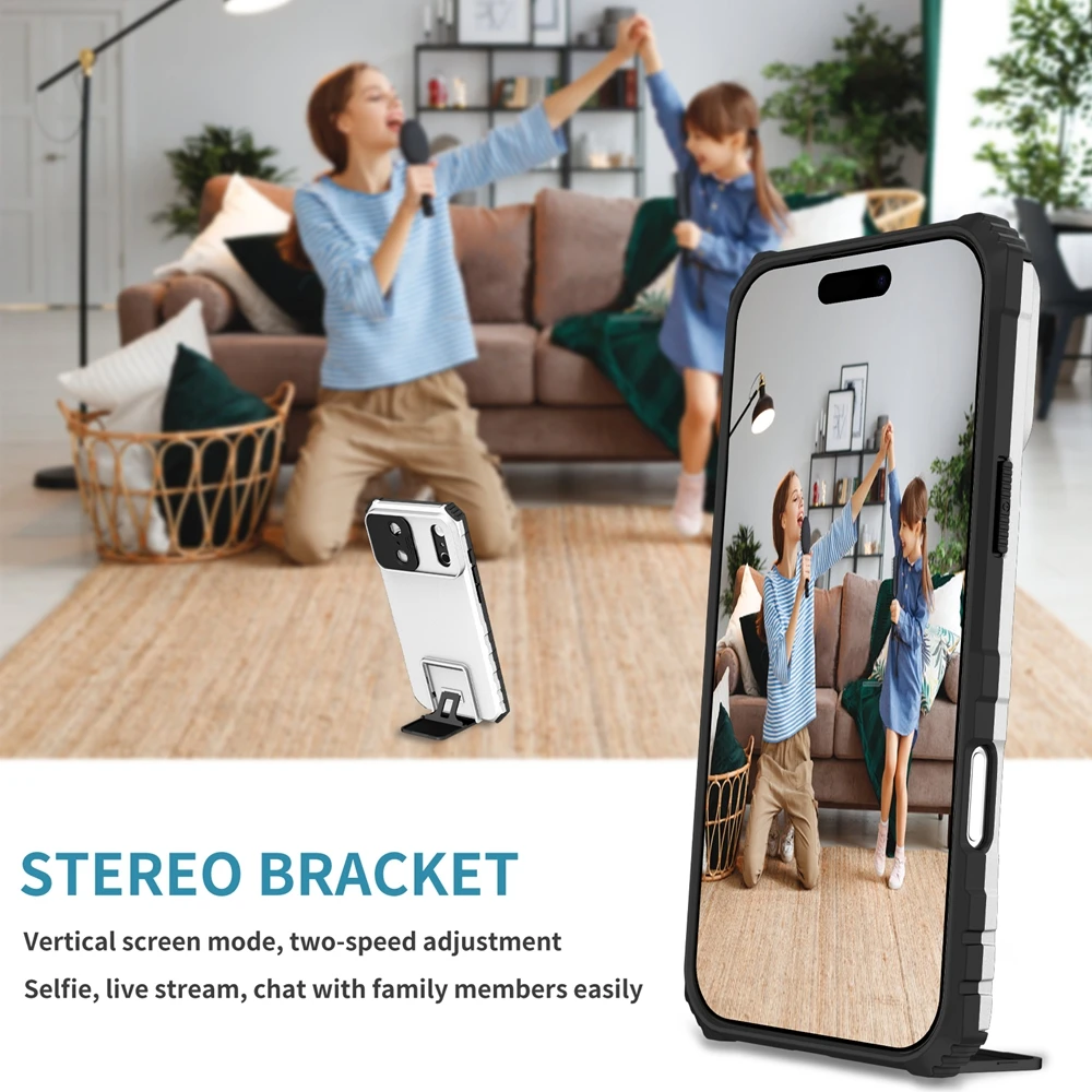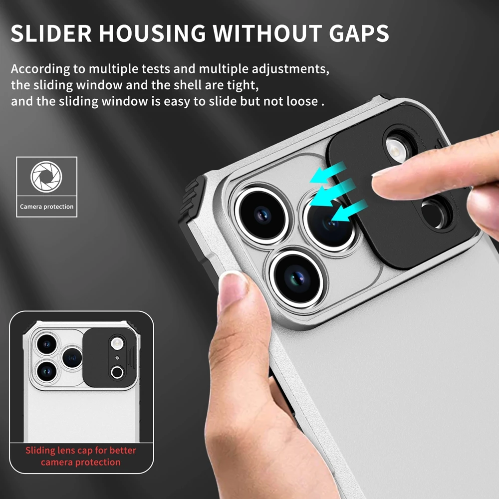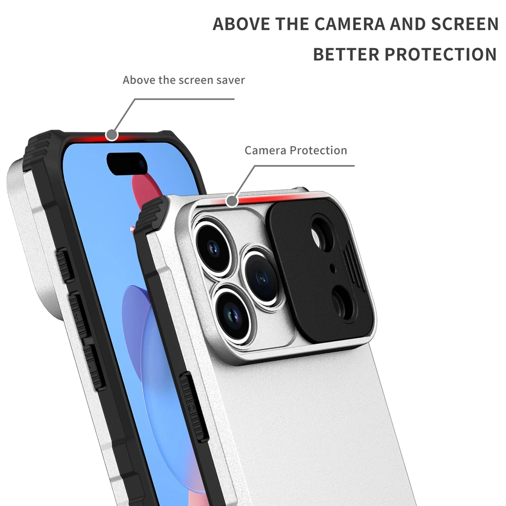 Built-in slide mechanism shields camera lenses from scratches, dust, and impact while enhancing privacy.Dual-Layer Shockproof Armor