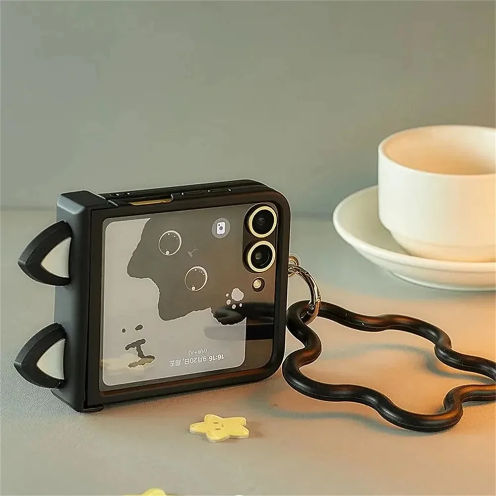 Cute cat ears phone case for Motorola Razr, Samsung Galaxy Z Flip, and Xiaomi Mix Flip. Shockproof soft full-coverage case with chain lanyard.