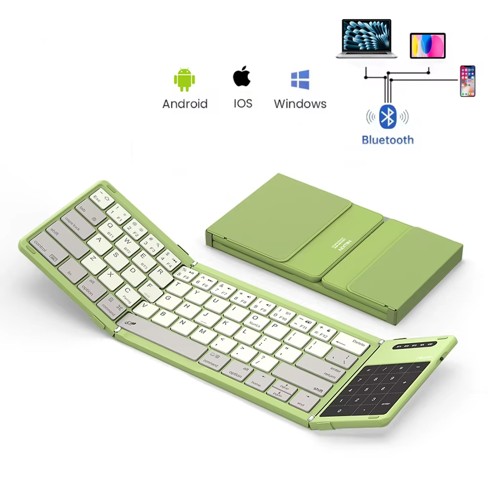 Portable foldable Bluetooth keyboard with touchpad. Rechargeable, lightweight, and compatible with Windows, iOS, Android, Mac, tablets, and smartphones.