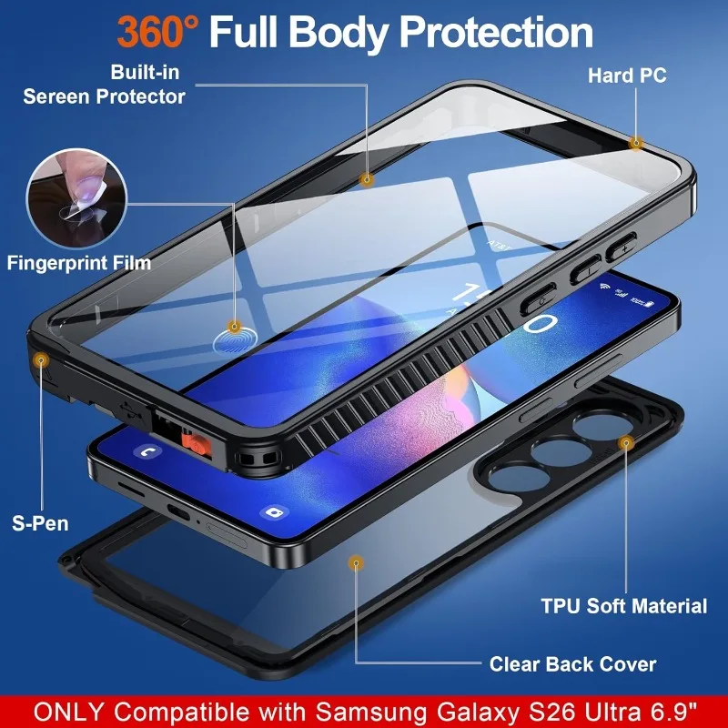 Designed to fit Samsung S24–S26 Ultra/Plus and A37–A57 series, every button, port, and control is fully functional. Its dual-layer construction combines high-quality TPU and plastic to absorb impacts, safeguard against drops, and shield your phone from dirt, snow, and heavy dust. With the transparent front and back, you can capture high-definition photos and videos underwater while keeping your device fully protected.