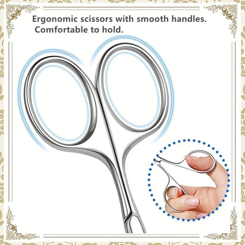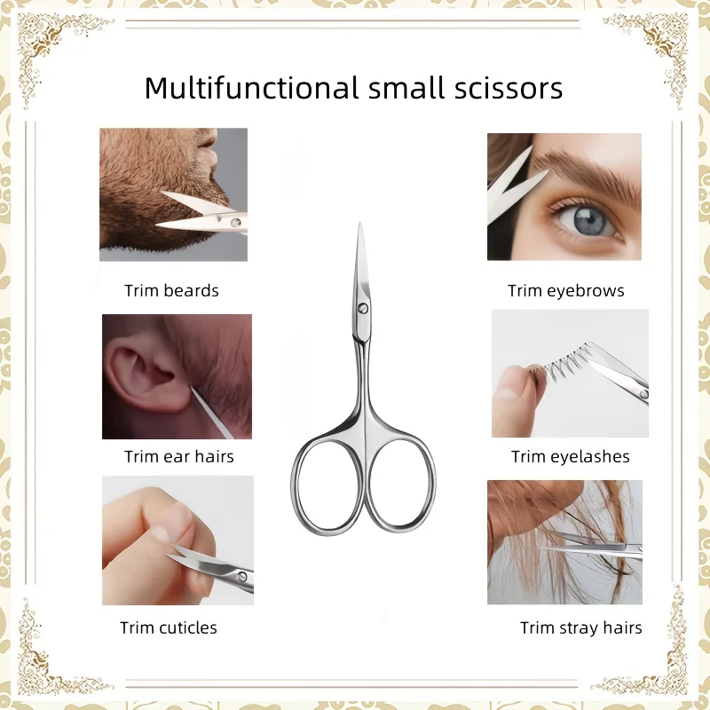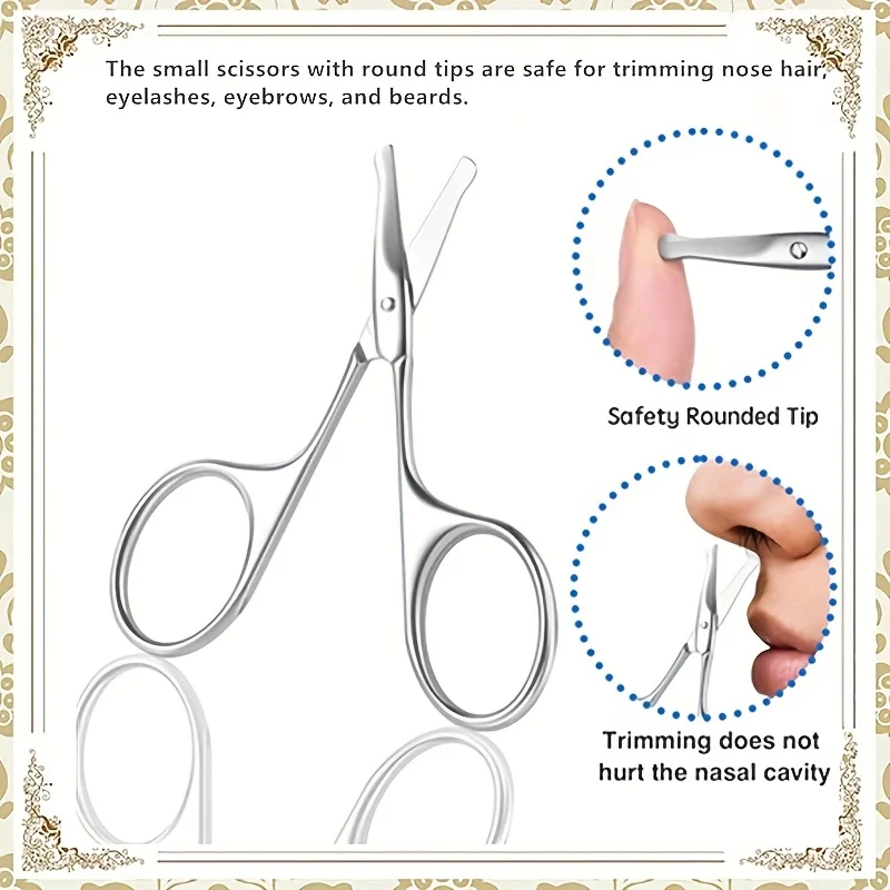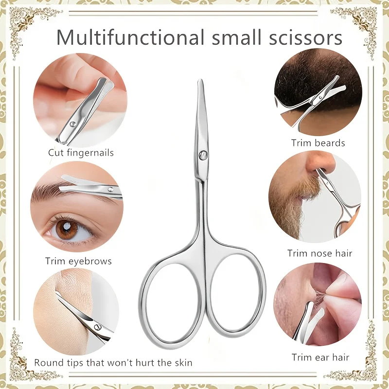 Safe and precise multifunctional small scissors with rounded tips. Ideal for nose hair, eyebrows, beards, eyelashes, and infant nails. Durable stainless steel construction.