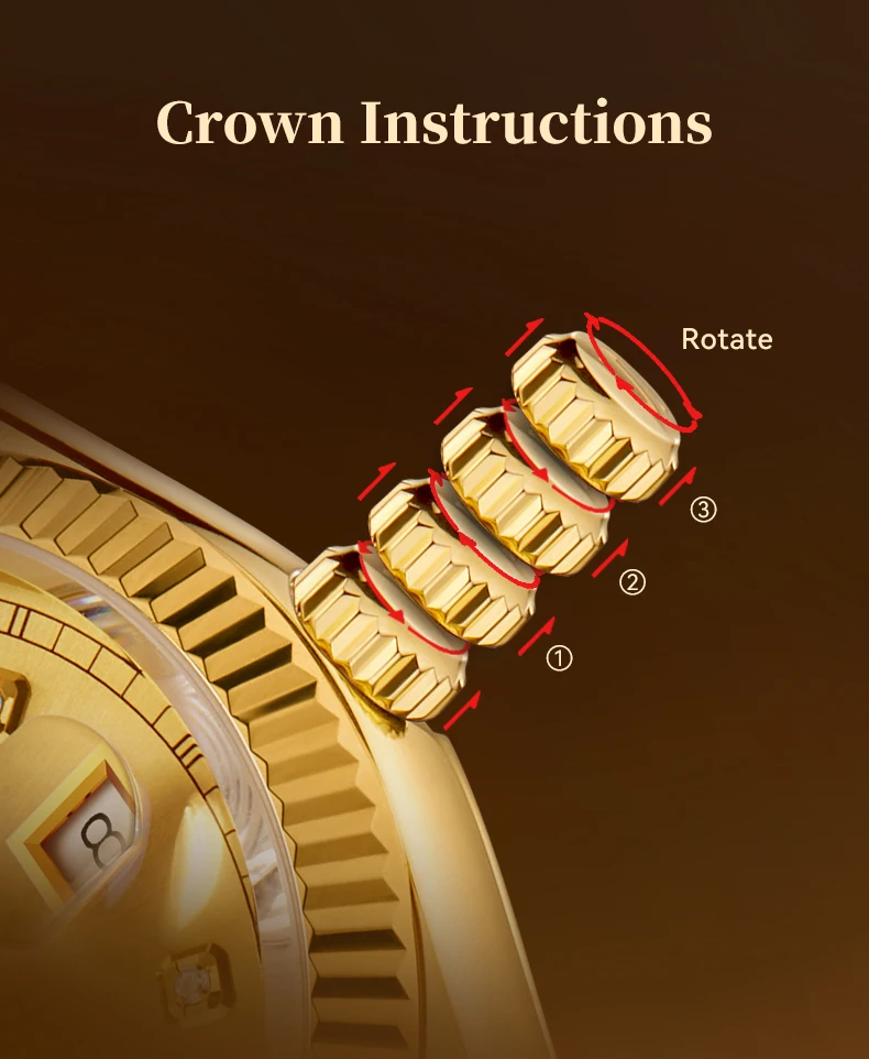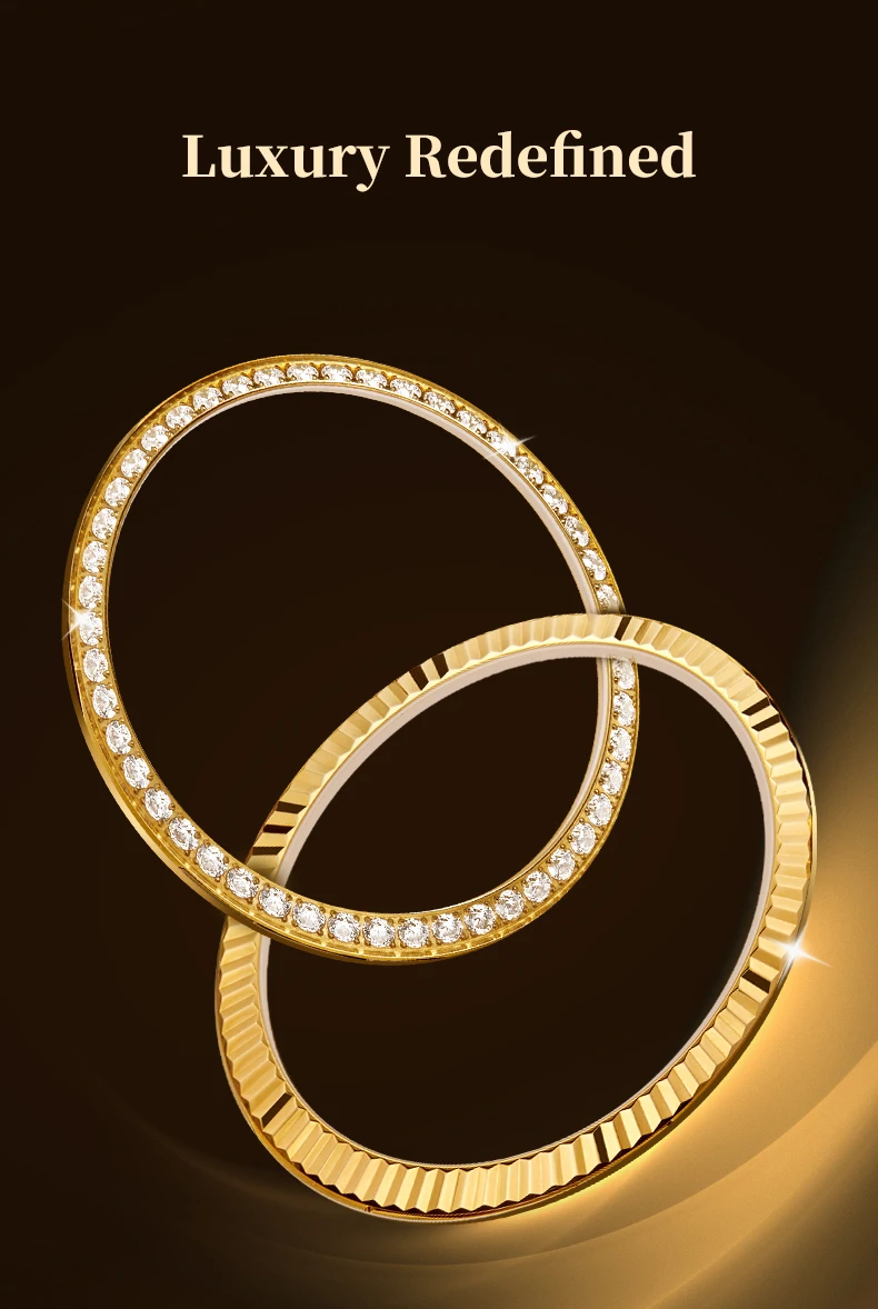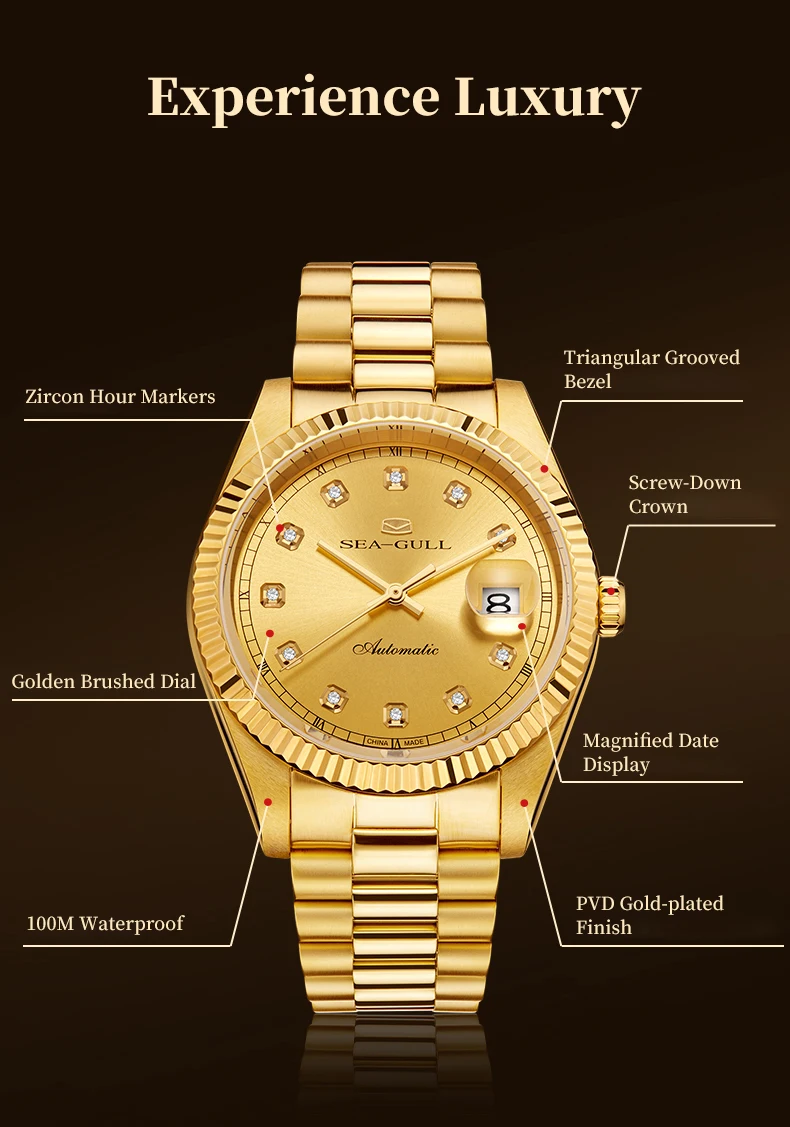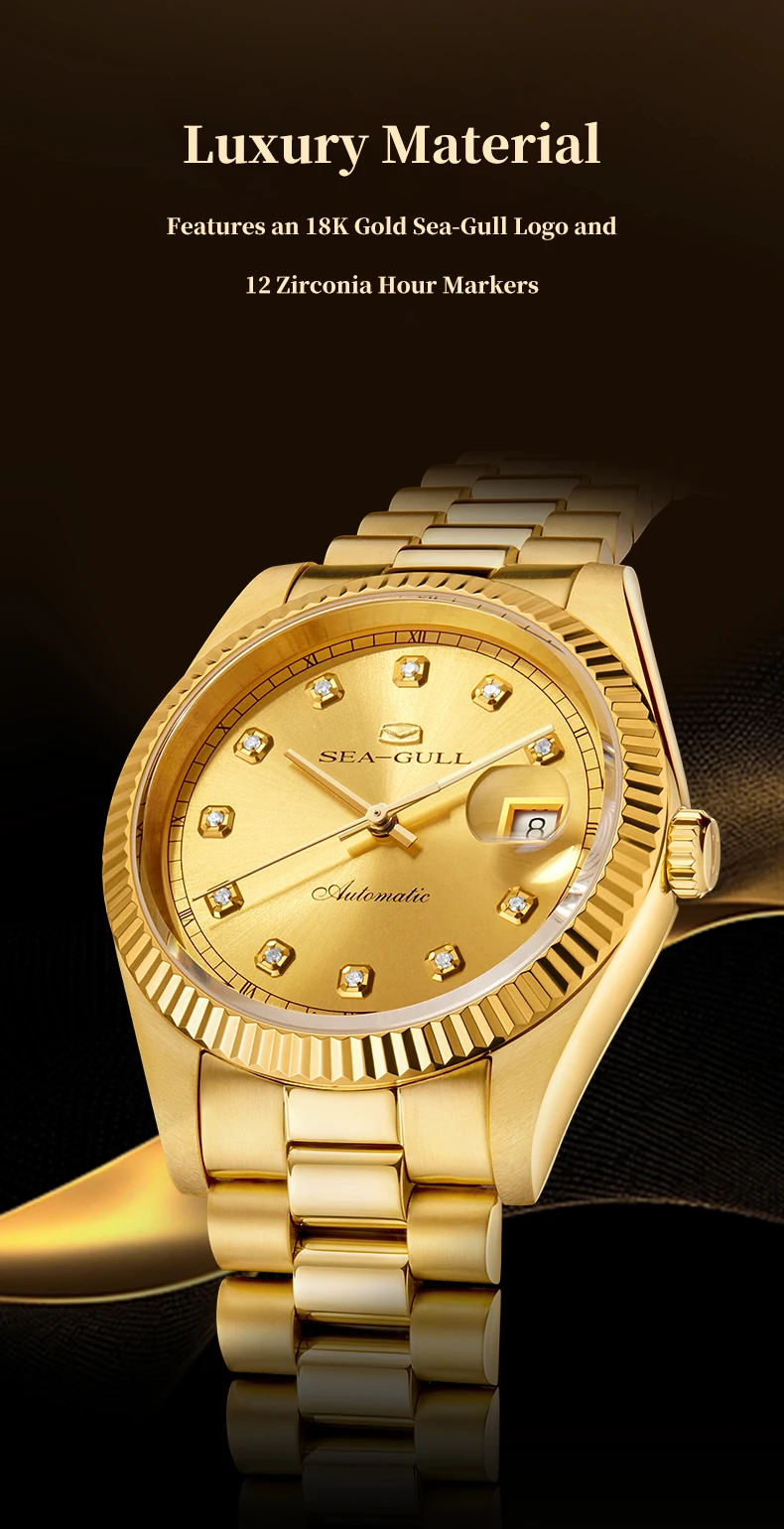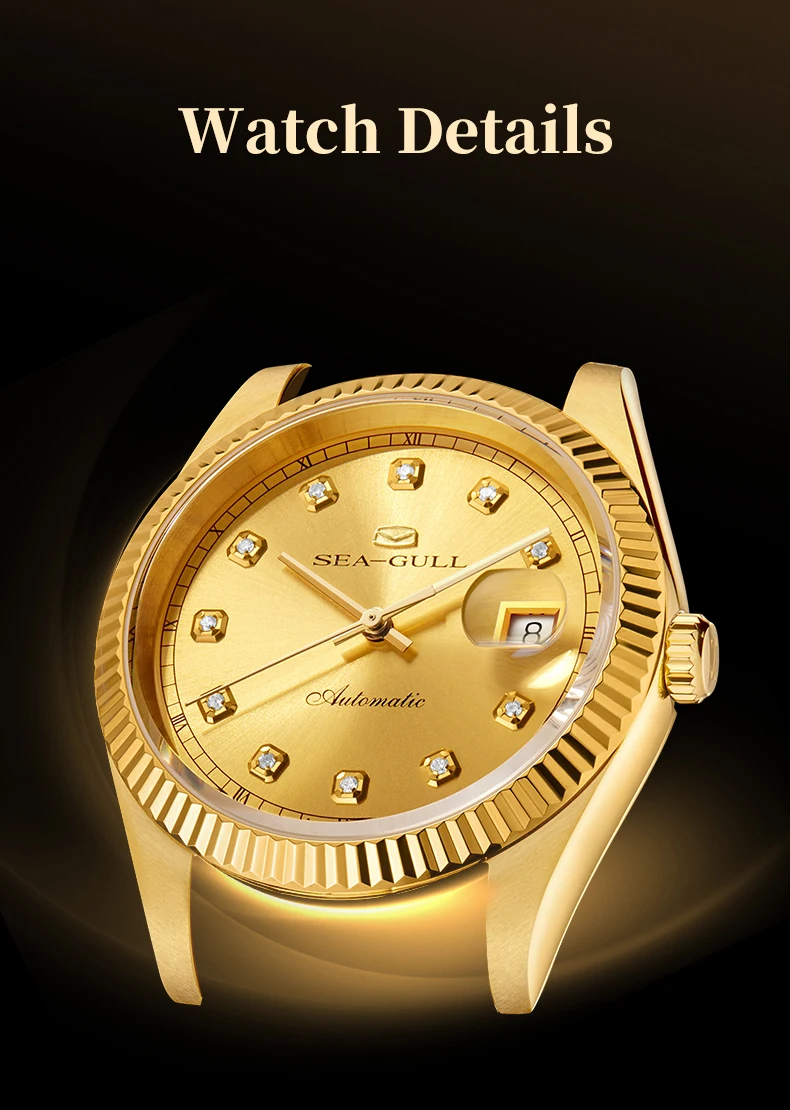 Reliable self-winding movement with 21,600 vibrations/hour, delivering smooth and accurate timekeeping.Luxury Gold Design with Diamond Accents