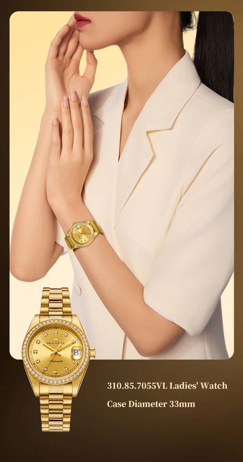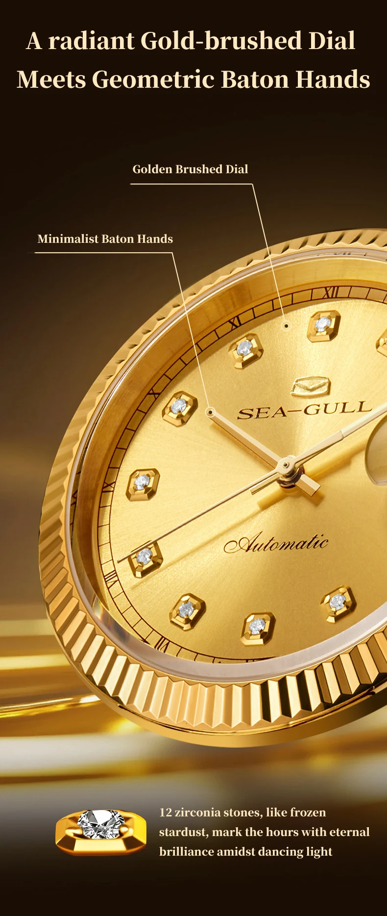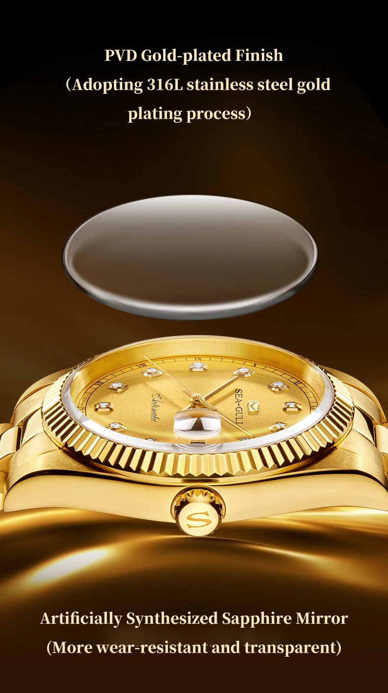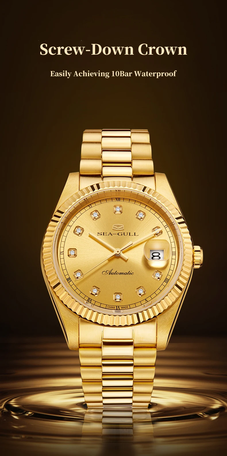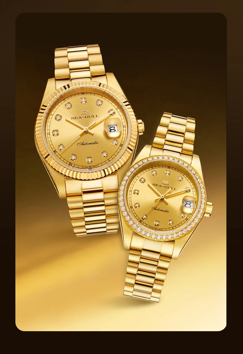 sea gull couple watch, sea gull automatic watch, luxury gold mechanical watch, men women couple wristwatch, sapphire crystal watch, 10bar waterproof watch, sea gull oriente series, diamond gold wristwatch