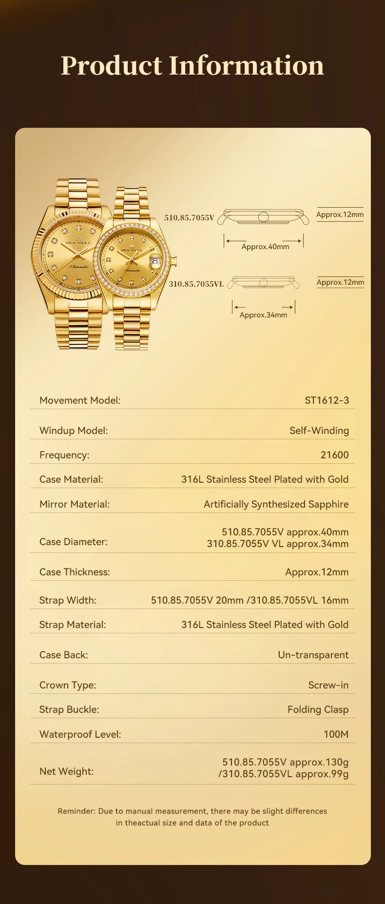 Luxury Sea-Gull Oriente Series couple watch with gold finish, sapphire crystal, automatic movement, diamond accents, and 10BAR water resistance.